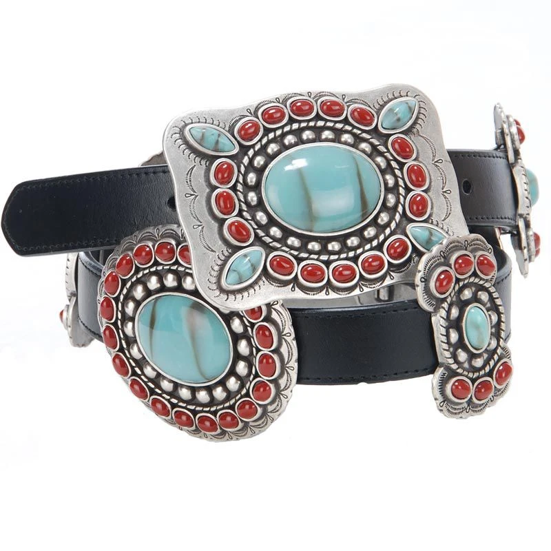 ThisĀ 3-DĀ belt buckle is made with black leather and is 1 inch wide. It has a square silver belt buckle that will never go out of style! This 3-DĀ belt has 4 large oval conchos that have similar details as the buckle. In between each large concho is a smaller concho. The belt buckle is detailed with an oval turquoise stone that is surrounded with smaller turquoise and red stones. The quality of the leather that this belt is made of is quality and will make the belts shine last longer. Turquoise and red is a fun color combination that goes really well with any solid black or white shirt that will surely make the belt stand out!