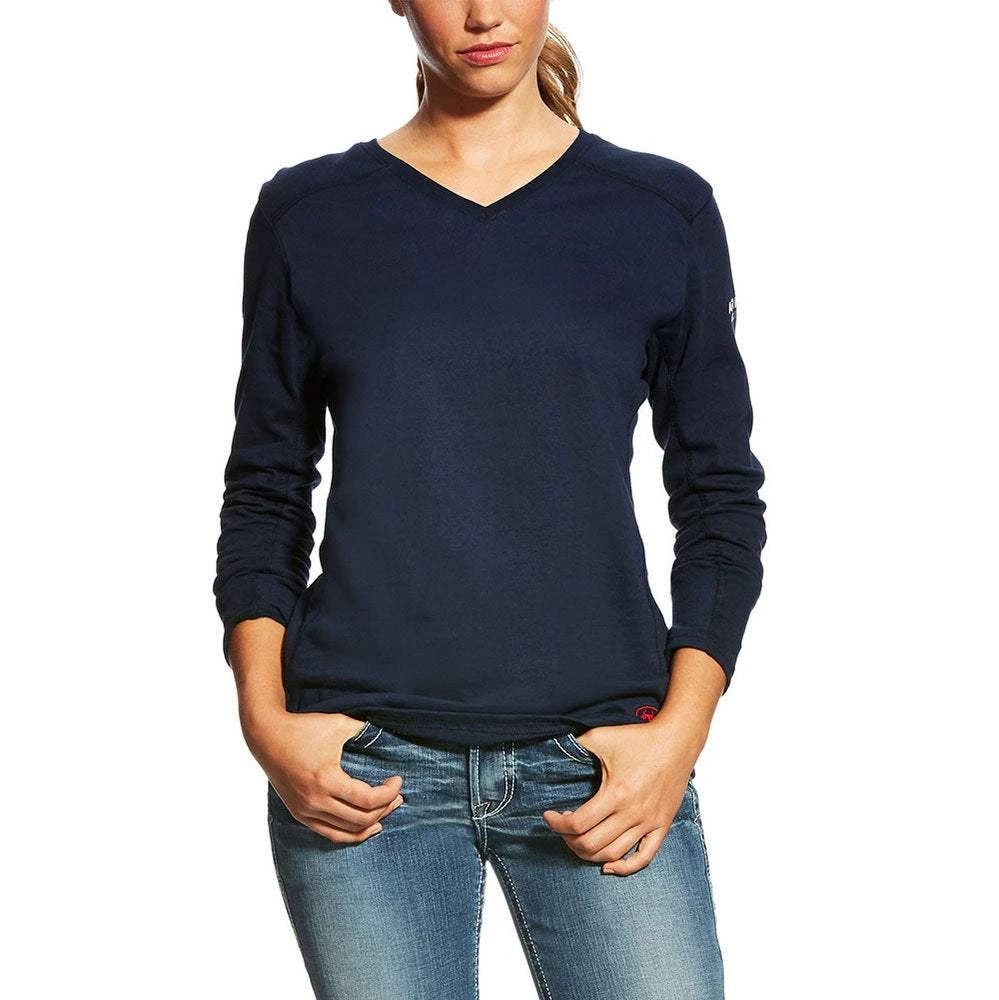 This Ladies Ariat FR V-Neck Navy T-shirt is a great item to have on any job site. Stay warm on the job or in the arena.