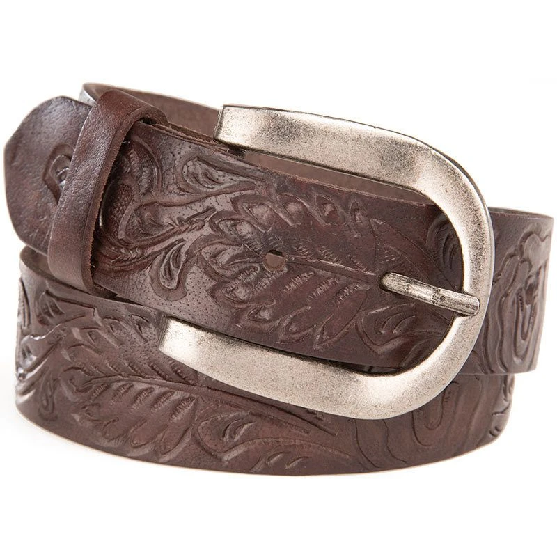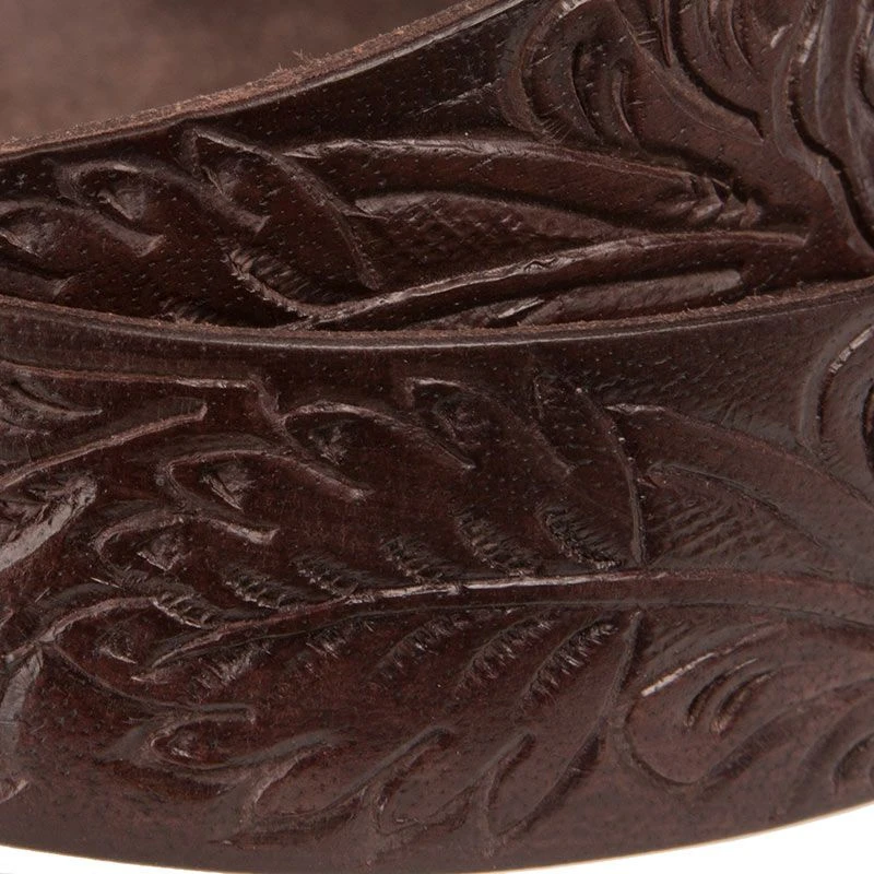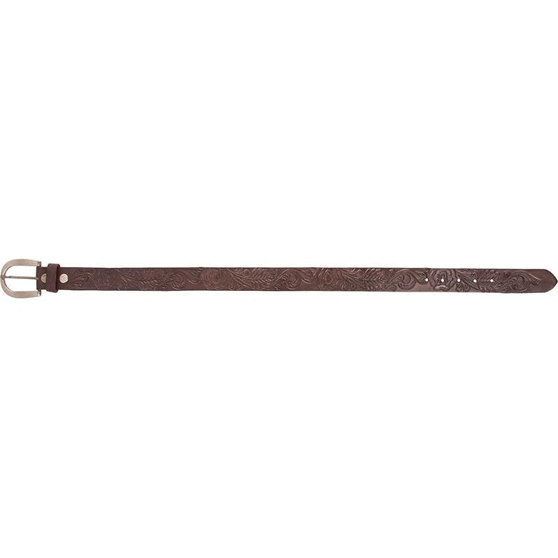 This brown tooled belt is a classic look that will pair nicely with any outfit!