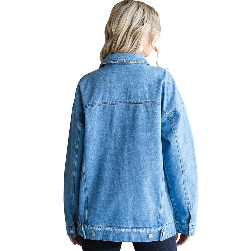 Denim jacket with a studded collar, long sleeves, chest pockets, and side pockets