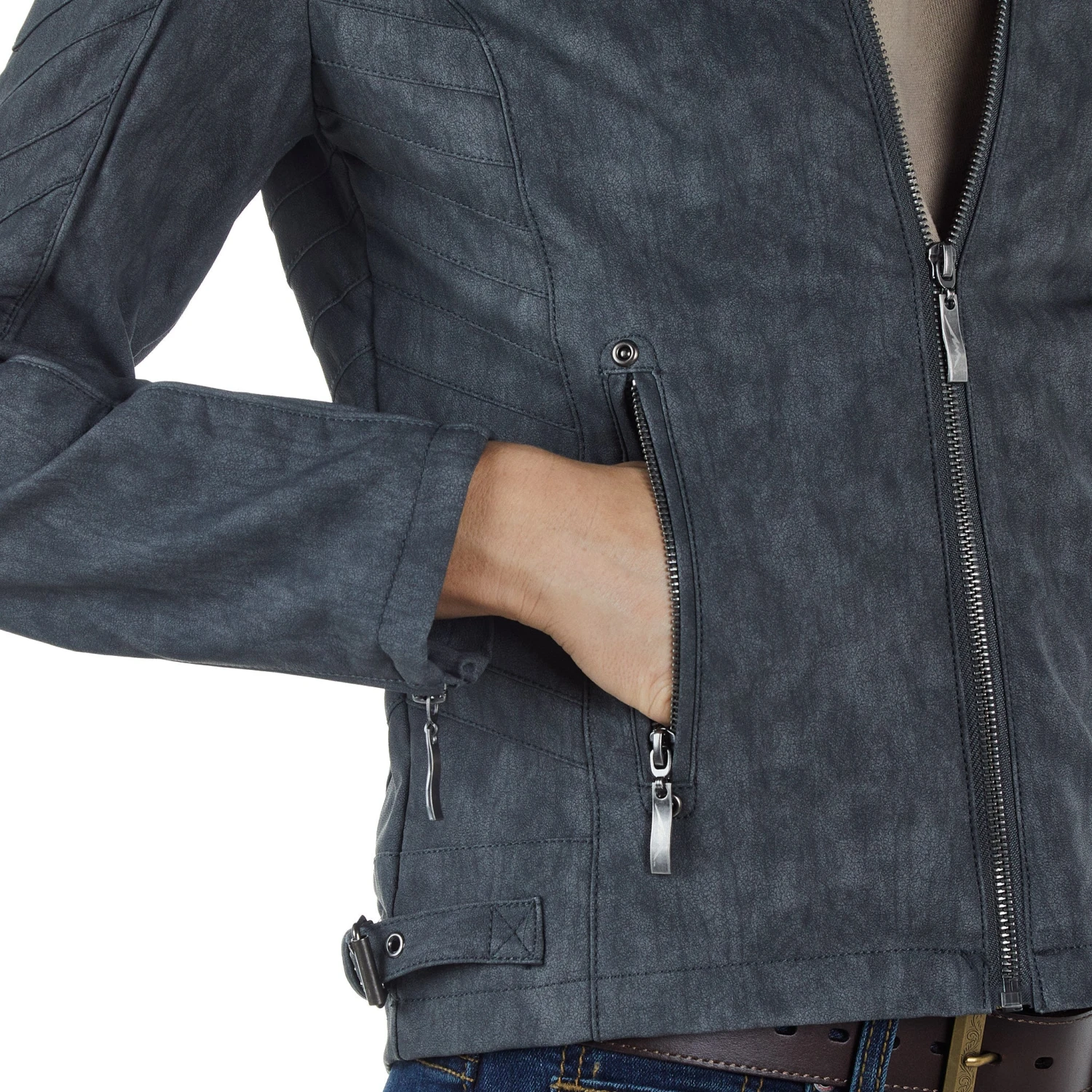 Faux leather jacket with unique seaming details and removable faux shearling collar.