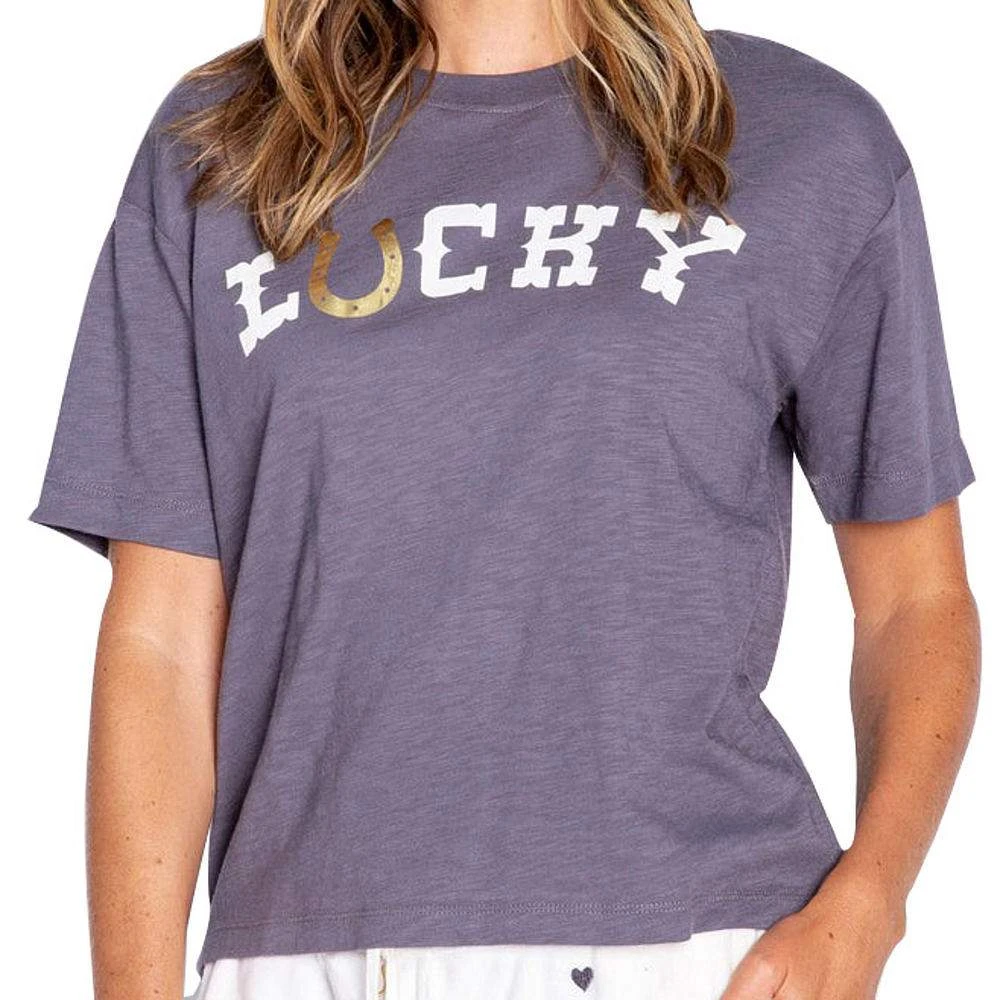 A ‘lucky’ tee in soft modal-cotton blend jersey. A relaxed fit, with front & back graphic print ‘Lucky’ on front, ‘In love’ on back.