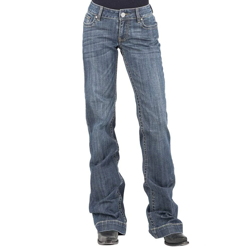 This Stetson trouser style jean sits just below the waist, and is moderately fit in the thigh with a flared leg.