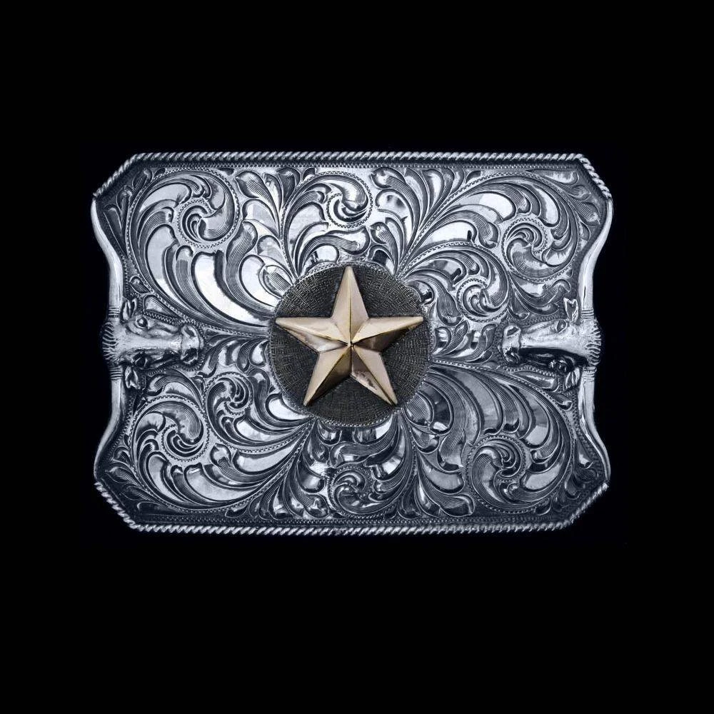 The Roundup Trophy Buckle is a fully hand engraved sterling silver buckle featuring a unique longhorn edge detail and a beautiful gold fill star in the center.